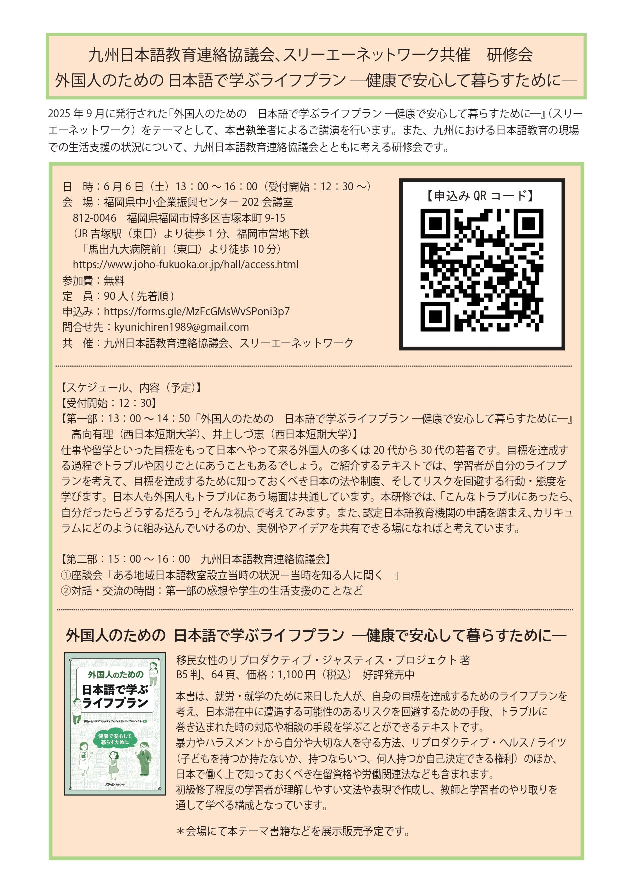 2025年9月に発行された『外国人のための 日本で学ぶライフプラン ―健康で安心して暮らすために―』(スリーエーネットワーク)をテーマとして、本書執筆者によるご講演を行います。また、九州における日本語教育の現場での生活支援の状況について、九州日本語教育連絡協議会とともに考える研修会です。