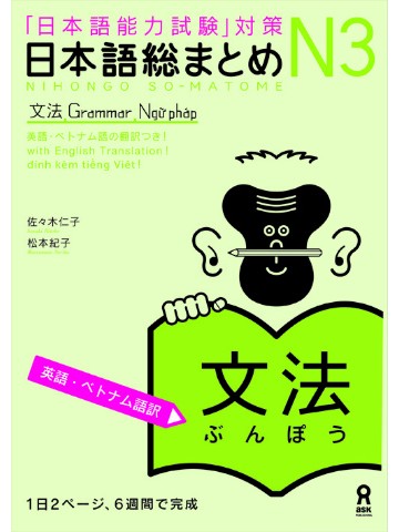 日本語総まとめ「N3」シリーズに、「英語・ベトナム語版」が加わりました。左ページに学習項目、右ページに練習問題を配置されており、見やすい見開きの構成で 1 日 2 ページずつ、負担なく学習を進めることができます。